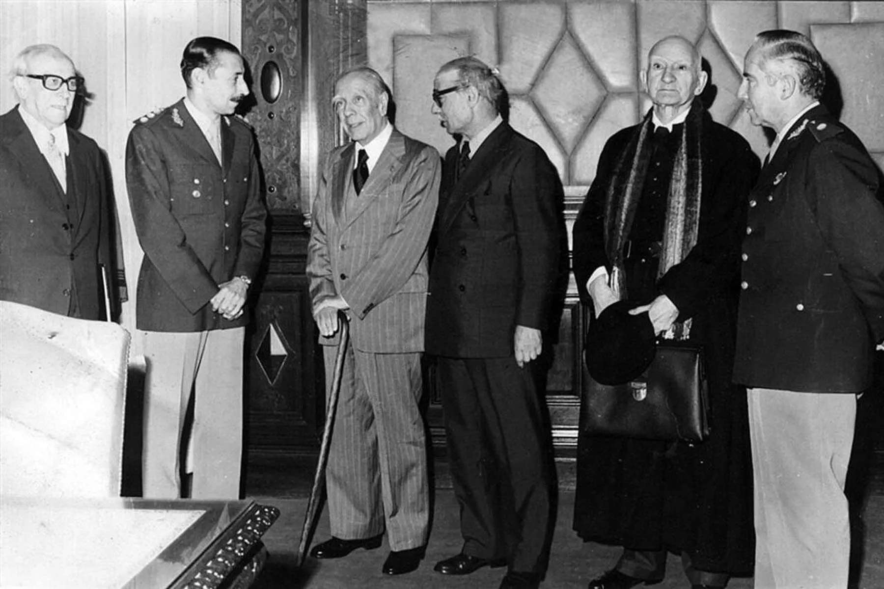 Videla en un encuentro con personajes de la cultura: Horacio Ratti, Presidente de la Sociedad Argentina de Escritores (SADE); Jorge Luis Borges; Ernesto Sabato y Leonardo Castellani, sacerdote y escritor. El régimen buscaba legitimarse y acercarse a la sociedad civil.